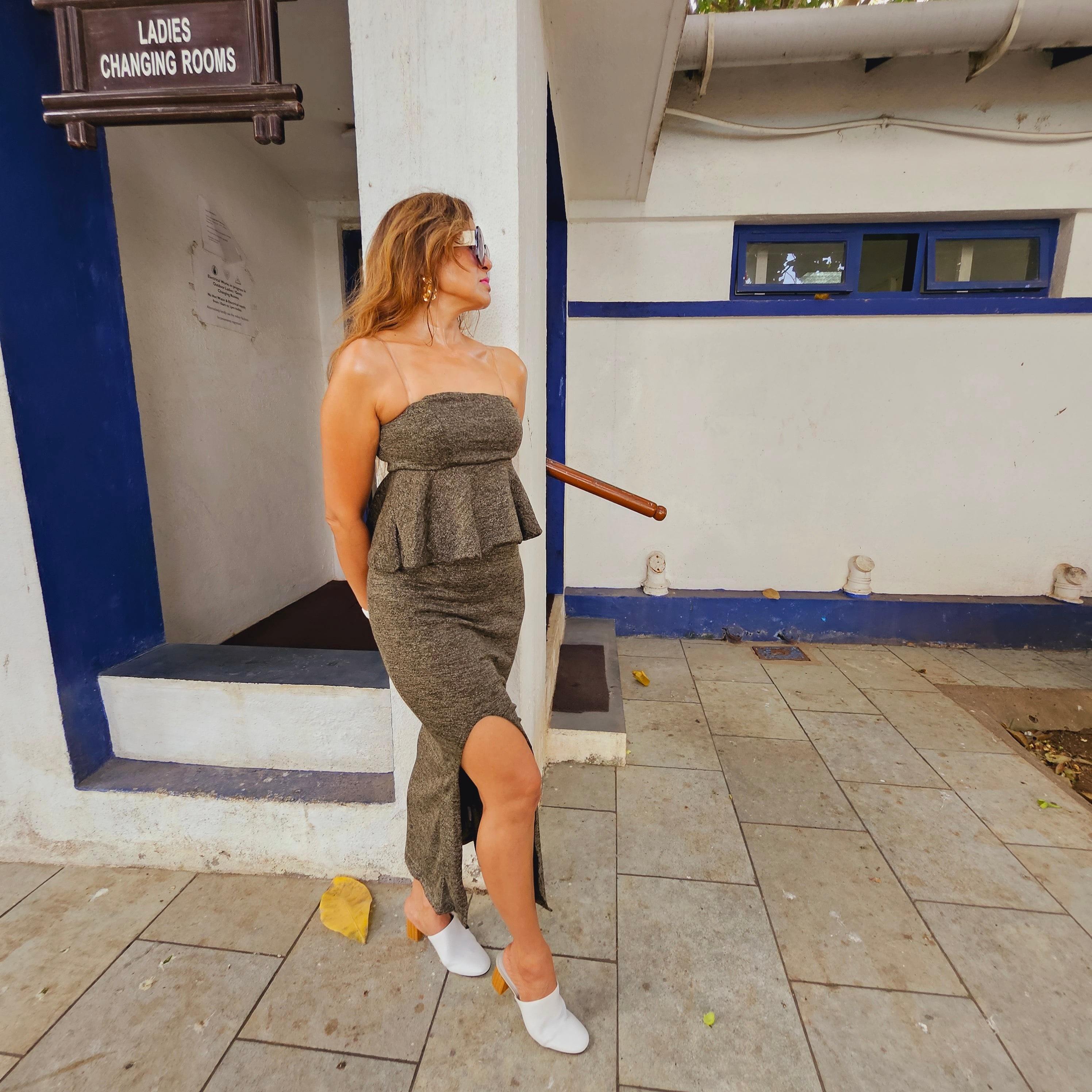 Green Shimmer Flounce Crop Top + Razor Cut Skirt Set