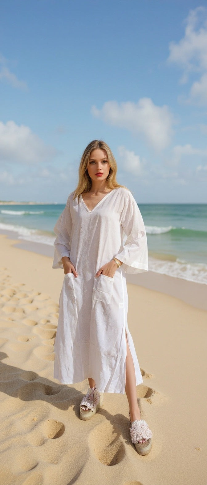 White Easy Breezy Front Pocket Kaftan Dress