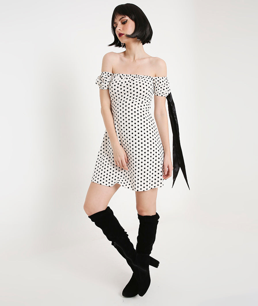 White Puff Sleeves Polka Dots Dress with Satin Sash