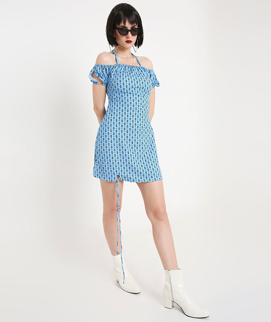 Card Print Mini Dress with Back TieUp and Side Knot Detail